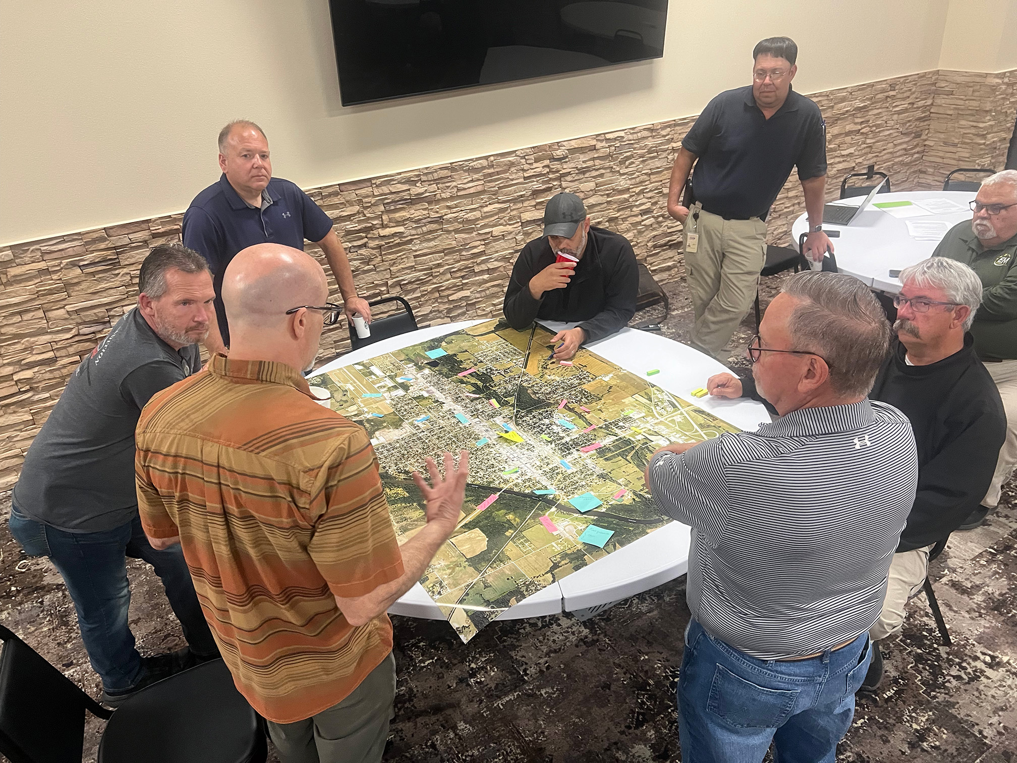 Emergency managers and local leaders gather around a large map, discussing potential flooding areas of concern.