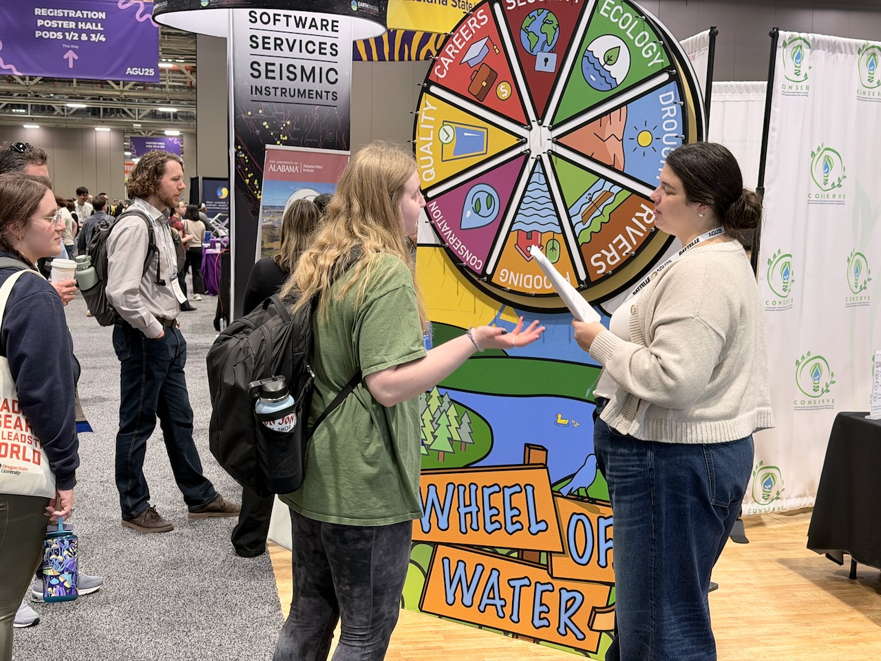 A centerpiece of the booth was the Wheel of Water, an interactive activity designed to encourage informal, approachable discussions around water science, forecasting challenges and real-world impacts. The activity drew steady interest from students and early-career scientists, creating opportunities to connect research concepts with lived experiences and decision-making needs.